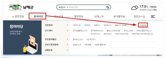 ▼ 남해군 홈페이지 메뉴 "참여마당" > "구인구직"을 클릭해 주세요. (바로가기)