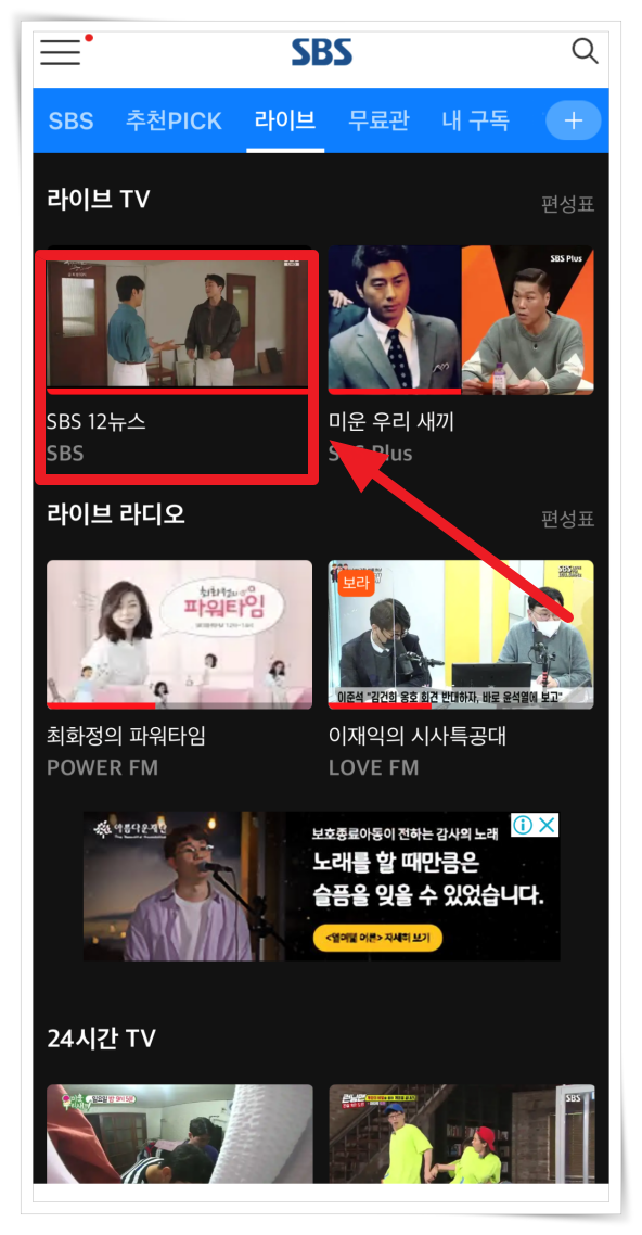 3. 라이브 TV 채널에서 "SBS"를 클릭해 주세요.